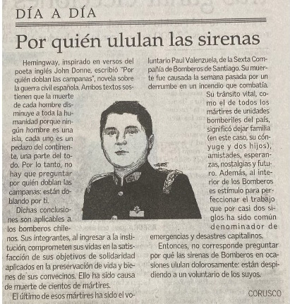 “Ciertamente, sentimos por el Bombero Mártir, don Paul Cristoffer Valenzuela Muñoz un dolor profundo por su fallecimiento, rabia y desconsuelo, pero la llama fraterna que alimentó su vida bomberil no se ha apagado, su nombre, su ejemplo, su vida, el amor por esta institución benemérita que tiene presencia en todo el país, será el incentivo para continuar con su obra interrumpida. Se seguirá salvando gente y protegiendo sus hogares, en forma voluntaria, por parte nuestra”, expresó.